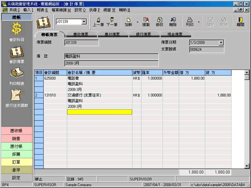 - 管理帳類 (銀行帳、應收帳、應付帳、匯價損益、薪金帳、存貨帳)