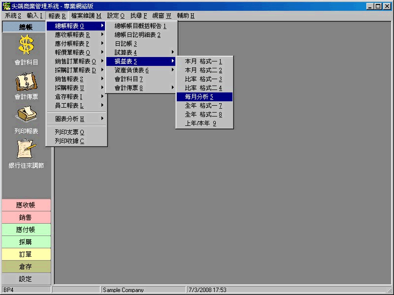 - 總帳報表包括:日記帳報表、明細帳報表、試算表、損益表及資料負債表等等。