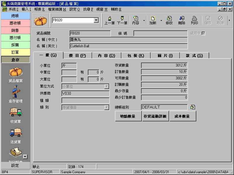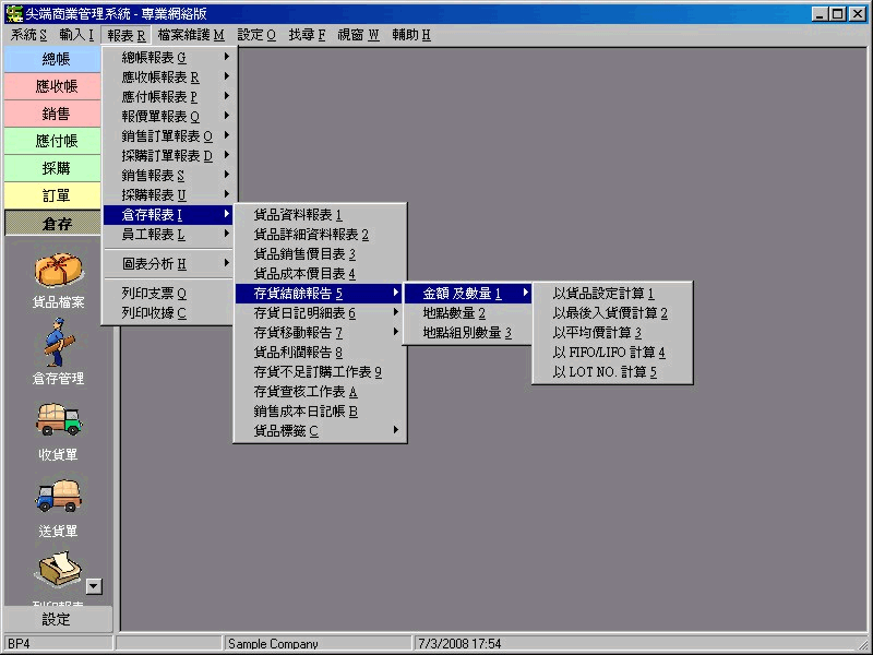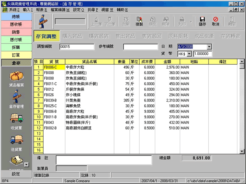 庫存管理系統包括倉存管理,貨品資料,送收貨單等功能, 貨品資料除了可輸入基本資料外還支援條碼(Barcode) 、圖像格式、大小單位、兩組數量, 而利用庫存管理可替貨品進倉、出倉、轉倉、損毀從而整理貨品存量。 本系統支援中英介面,在不需登出系統的情況下還可轉換中英文介面。 更可配以本公司之多公司、多貨幣、多倉庫、多用戶版本及其他管理系統一同使用。